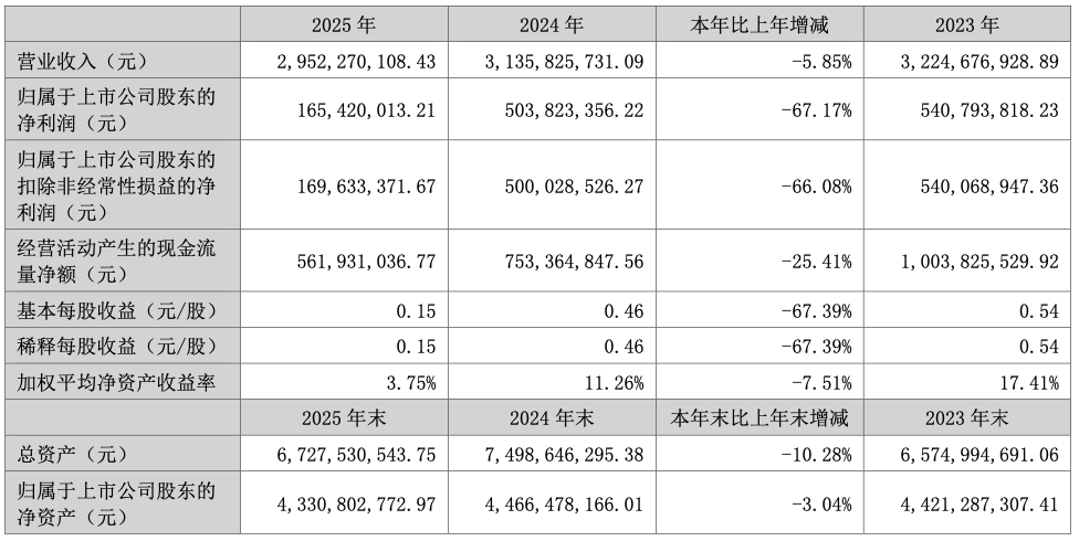 3月25日,益生股份(002458)公告,公司2025年兑现交易收入29.52亿元,同比着落5.85%;包摄于上市公司鼓舞的净利润1.65亿元,同比减少67.17%;基本每股收益0.15元,同比着落67.39%。