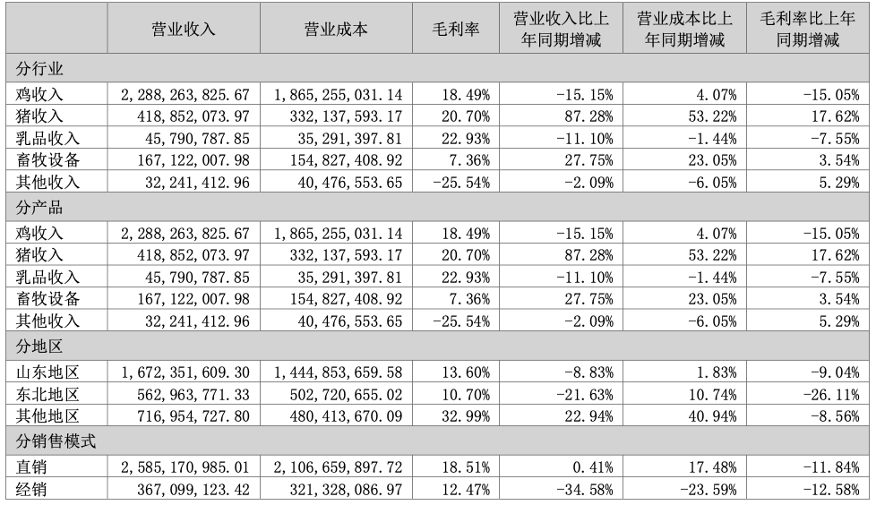 分业务来看,财报露出,益生股份2025年鸡收入同比下滑15.15%至2,288,263,825.67元;猪收入同比增长87.28%至418,852,073.97元。